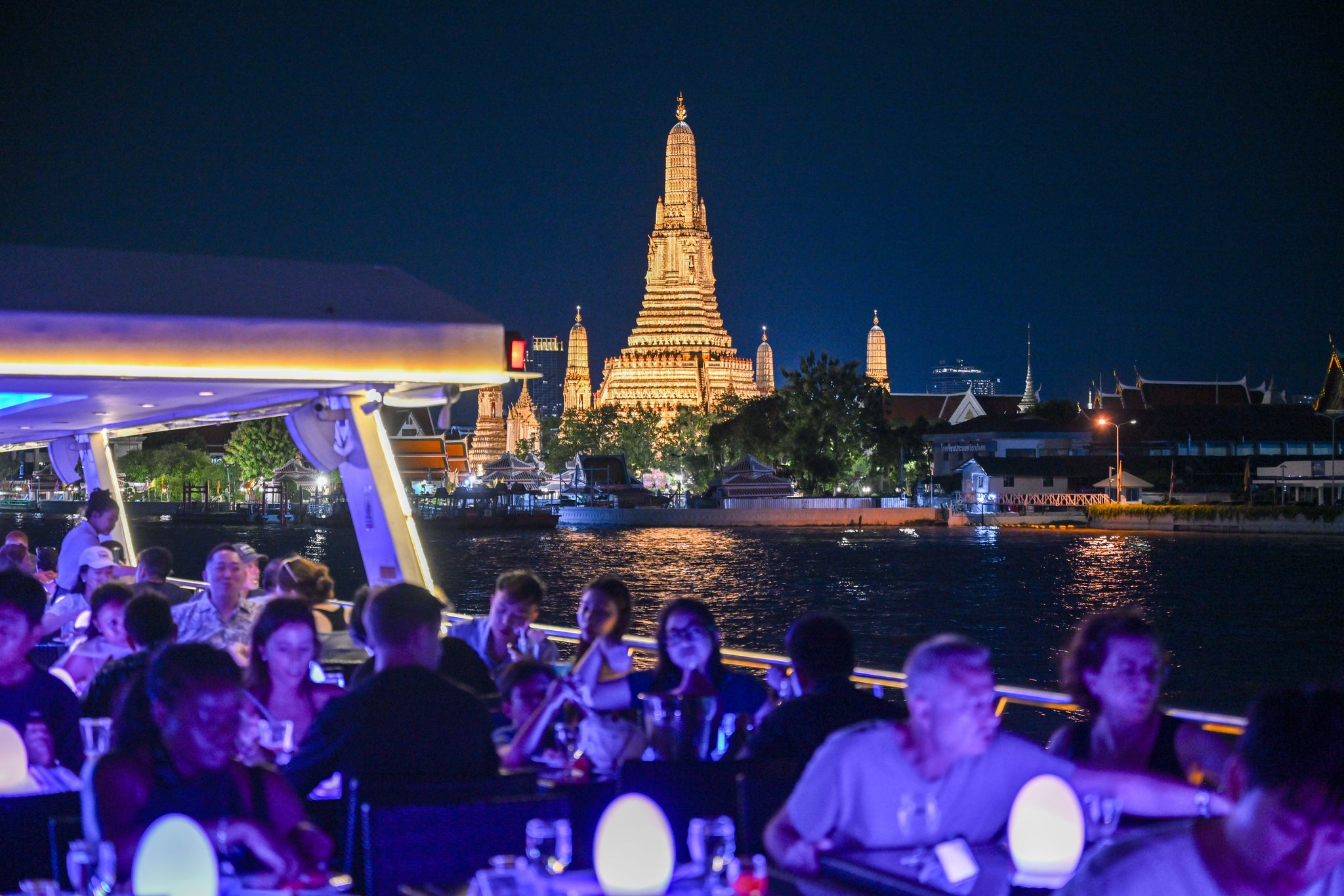 或是在兩小時的航程中,一邊享用國際自助餐,一邊欣賞河岸兩側大皇宮、鄭王廟的璀璨夜景。